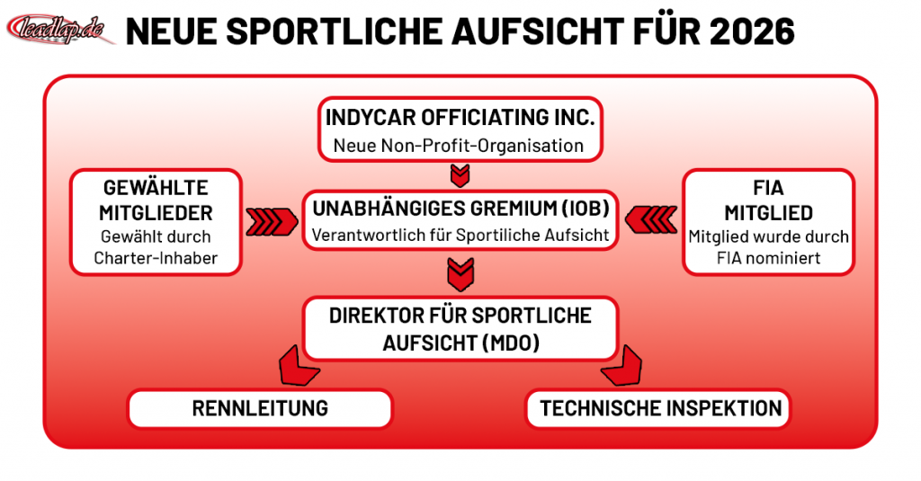 Ab 2026 gibt es ein neues, unabhängiges Aufsichtsgremium für die IndyCar Series. Mit diesem Schritt führt der Eigentümer Penske Entertainment eine eigenständige Non-Profit-Organisation namens IndyCar Officiating Inc. ein. Diese wird künftig die sportliche Aufsicht über die nordamerikanische Formelserie sowie die offizielle Nachwuchsserie IndyNXT übernehmen.