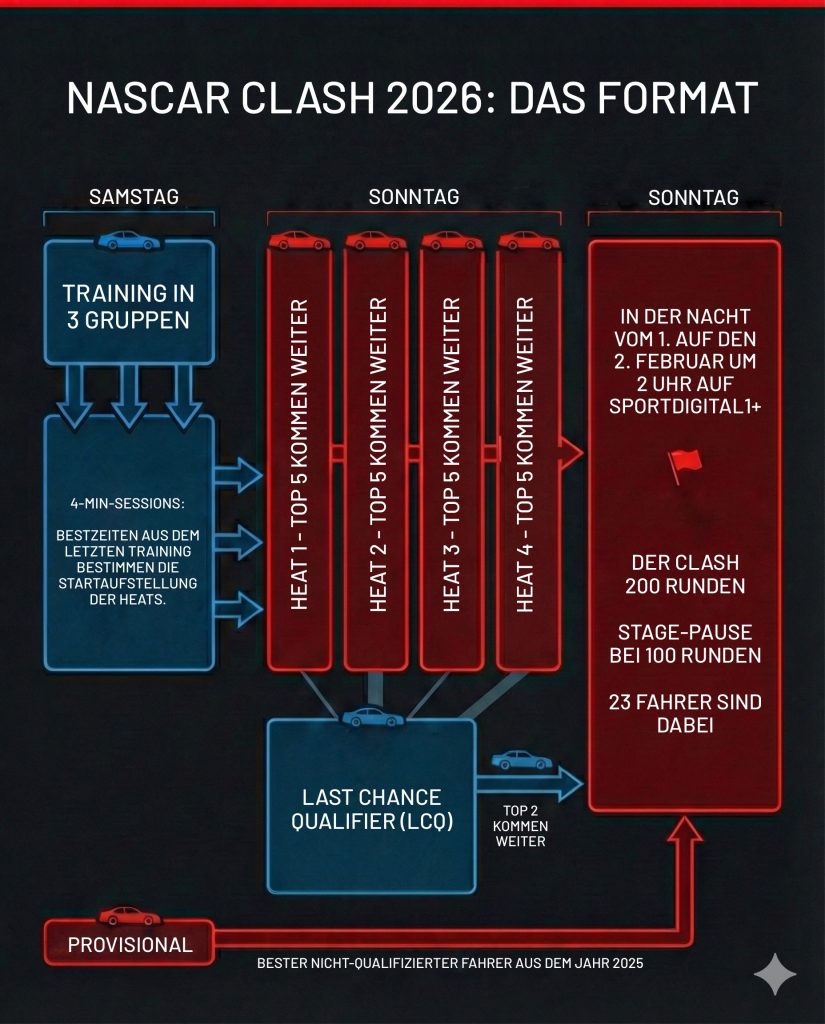 NASCAR macht keine halben Sachen und behält das Format von 2025 bei. Das bedeutet: Wer den Clash gewinnen will, muss sich durchbeißen. Die Action beginnt bereits am Samstag, den 31. Januar, wenn die Motoren für die Trainingsgruppen gestartet werden.